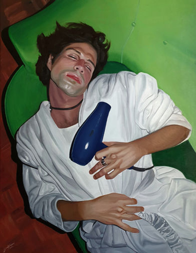 Sandro Santalucia studiert Intermedia mit Schwerpunkt auf künstlerischer Forschung an der UzK. Seine Malerei ist angetrieben von dem Impuls, Archetypen, innere Zustände und schwer fassbare Empfindungen in eine Form zu bringen, die konkret und abstrakt zugleich ist. Inspiriert von den Menschen aus seinem Umfeld entstehen seine figurativen Gemälde mit surrealen Elementen auf der Basis spontaner gedanklicher Bilder, die mithilfe von Fotografie und digitalen Collagen als Referenz dienen. Thematisch spielt dabei oftmals die Transgression, also das Überschreiten von Normen und Konformitäten, ein zentrale Rolle.
